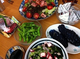 昨夜の夕飯。久々のタコ刺し、いんげんの胡麻和え 相変わらずちょびは伸びております。